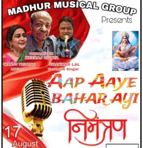 संगीतमय कार्यक्रम “आप आए बहार आई” का आयोजन 17 अगस्त को लाजपत भवन ओडिटोरिम दिल्ली में होगा