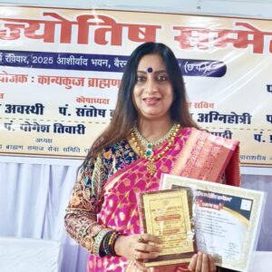 मुंबई/ रायपुर छत्तीसगढ़, कान्यकुब्ज ब्राह्मण समाज के तहत,अखंड ब्राह्मण समाज सेवा समिति, पाराशरीय ज्योतिष संसथान रायपुर और श्री महाकाल धाम अमलेश्वर के संयुक्त तत्वावधान में पहले राष्ट्रीय ज्योतिष सम्मेलन का आयोजन हाल ही में किया गया था, जिसमें बॉलीवुड से फिल्म टीवी कलाकार और अंतरराष्ट्रीय स्तर पर प्रसिद्ध ज्योतिषी व टैरो कार्ड रीडर डॉ. शची केशरी को भी ज्योतिष शिरोमानी सम्मान से सम्मानित किया गया। यह सम्मान ग्रहण करने के लिए विशेष रूप से फिल्म टीवी कलाकार एवं अंतर्राष्ट्रीय ख्याति प्राप्त ज्योतिषी व टैरो कार्ड रीडर डॉ. शची केशरी मुंबई से रायपुर (छत्तीसगढ़) में पधारी थी। इस विशाल ज्योतिष सम्मेलन में डॉ. शची केशरी को उनके द्वारा ज्योतिष के क्षेत्र में किए गए कार्यो और अनुसंधान के लिए उन्हें “ज्योतिष शिरोमानी’ पुरस्कार दिया गया।